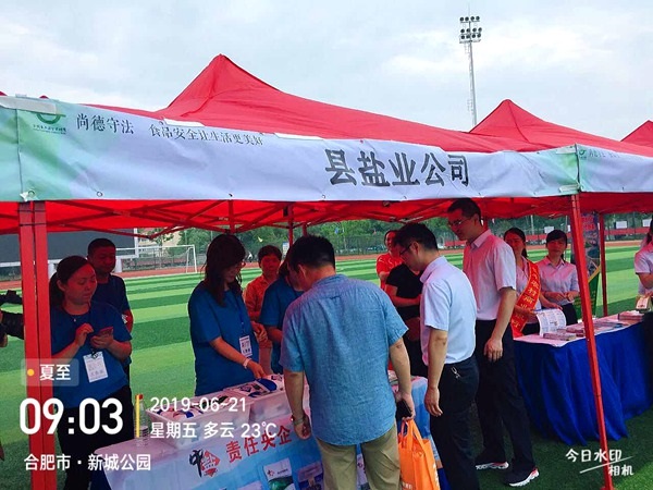 按照統(tǒng)一部署,6月21日早晨,長豐縣鹽業(yè)公司5名工作人員早早就來到了活動現(xiàn)場,帶著《食鹽專營辦法》等宣傳資料、品種鹽樣品及訂制的水杯參加宣傳活動。啟動儀式開始后,首先由縣政協(xié)副主席致辭;接著是合肥伊利乳業(yè)有限責任公司代表食品生產企業(yè)作承諾發(fā)言;最后由縣人大副主任宣布“長豐縣2019年食品安全宣傳周暨食品安全長豐行活動正式啟動”并會同場上領導共同按下儀式啟動球?;顒?/FONT>現(xiàn)場人群涌動,氣氛熱烈,長豐公司5名工作人員穿著統(tǒng)一T恤,佩戴著工作證,分別在兩個展臺開展宣傳。主要宣傳《食鹽專營辦法》、講解多品種鹽知識,推崇“吃好鹽 選中鹽”,吃鹽首選“綠色食品鹽”的健康理念。