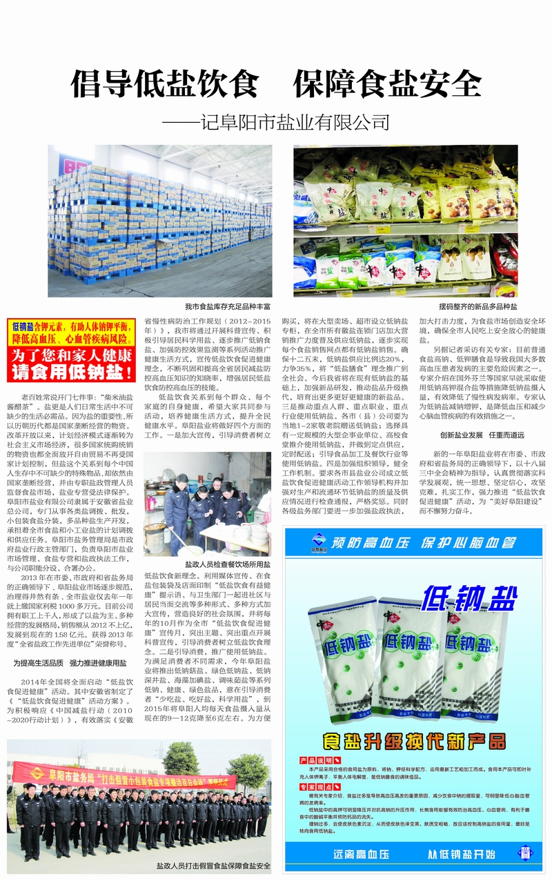 低鹽飲食關系到每個群眾、每個家庭的自身健康,希望大家共同參與活動,培養(yǎng)健康生活方式,提升全民健康水平。阜陽鹽業(yè)將做好四個方面的工作。一是加大宣傳,引導消費者樹立低鹽飲食新理念。利用媒體宣傳、在食鹽包裝袋及店面印制“低鹽飲食有益健康”提示語、與衛(wèi)生部門一起進社區(qū)與居民當面交流等多種形式、多種方式加大宣傳,營造良好的社會氛圍,并將每年的10月作為全市“低鹽飲食促進健康”宣傳月,突出主題、突出重點開展科普宣傳,引導消費者樹立低鹽飲食理念。二是引導消費,推廣使用低鈉鹽。為滿足消費者不同需求,今年阜陽鹽業(yè)將推出低鈉菇鹽、綠色低鈉鹽、低鈉深井鹽、海藻加碘鹽、調(diào)味菇鹽等系列低鈉、健康、綠色鹽品,意在引導消費者“少吃鹽、吃好鹽,科學用鹽”,到2015年將阜陽人均每天食鹽攝入量從現(xiàn)在的9—12克降至6克左右。為方便購買,將在大型賣場、超市設立低鈉鹽專柜,在全市所有徽鹽連鎖門店加大營銷推廣力度普及供應低鈉鹽,逐步實現(xiàn)每個食鹽銷售網(wǎng)點都有低鈉鹽銷售。確保十二五末,低鈉鹽供應比例達20%,力爭35%,將“低鹽膳食”理念推廣到全社會。今后我市將在現(xiàn)有低鈉鹽的基礎上,加強新品研發(fā),推動鹽品升級換代,培育出更多更好更健康的新鹽品。三是推動重點人群、重點職業(yè)、重點行業(yè)使用低鈉鹽。各市(縣)公司要為當?shù)?-2家敬老院贈送低鈉鹽;選擇具有一定規(guī)模的大型企事業(yè)單位、高校食堂推介使用低鈉鹽,并做到定點供應,定時配送;引導食品加工及餐飲行業(yè)等使用低鈉鹽。四是加強組織領導,健全工作機制。要求各市(縣)鹽業(yè)公司成立低鹽飲食促進健康活動工作領導機構(gòu)并加強對生產(chǎn)和流通環(huán)節(jié)低鈉鹽的質(zhì)量及供應情況進行檢查通報,嚴格獎懲。同時各級鹽務部門要進一步加強鹽政執(zhí)法,加大打擊力度,為食鹽市場創(chuàng)造安全環(huán)境,確保全市人民吃上安全放心的健康鹽。