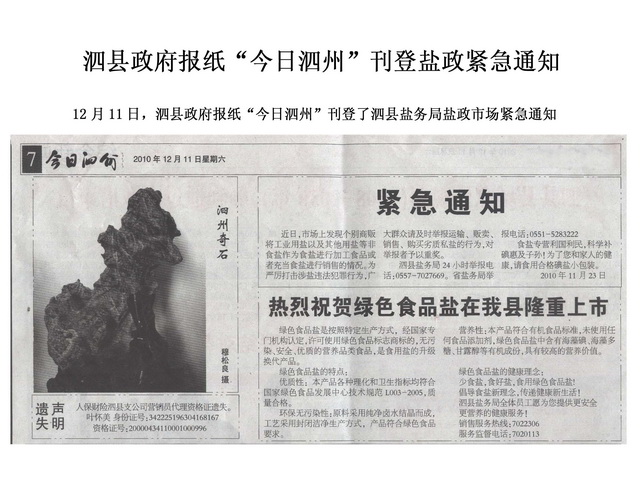 《今日泗州》刊登泗縣鹽務(wù)局鹽政市場緊急通知