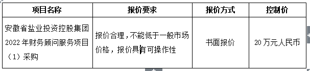 1.項(xiàng)目名稱:安徽省鹽業(yè)投資控股集團(tuán)2022年財(cái)務(wù)顧問服務(wù)項(xiàng)目(1)