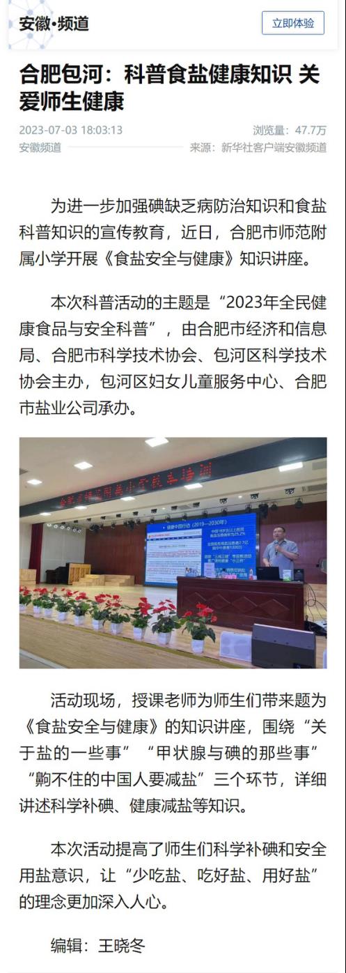 為切實做好黨的二十大精神宣傳貫徹工作,在習近平新時代中國特色社會主義思想指引下 ,進一步樹牢以人民健康為中心的發(fā)展思想,合肥鹽業(yè)在合肥市師范附屬小學開展食鹽科普活動,為全校200余名師生普及科學補碘、健康減鹽知識,關(guān)愛師生健康,推廣中鹽低鈉鹽,助力健康中國建設(shè),食鹽健康科普活動得到新華社客戶端安徽頻道關(guān)注報道,截至發(fā)稿日總瀏覽量達47.7萬次。